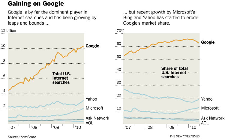 Die New York Times hat in einer Grafik übersichtlich die Marktanteile der führenden Suchmaschinen in den USA über den Verlauf mehrerer Jahre zusammengefasst.